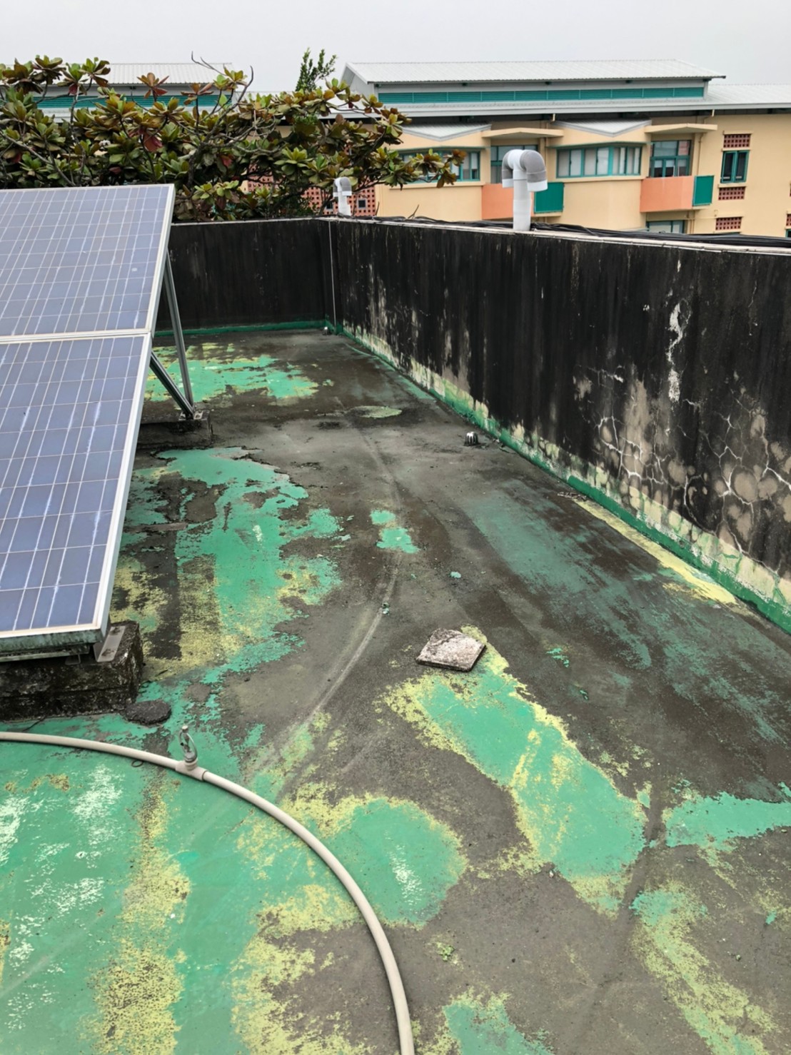 以下是現勘的照片,防水層已經斑駁,那天剛好有工班正在努力清潔準備做重新做防水